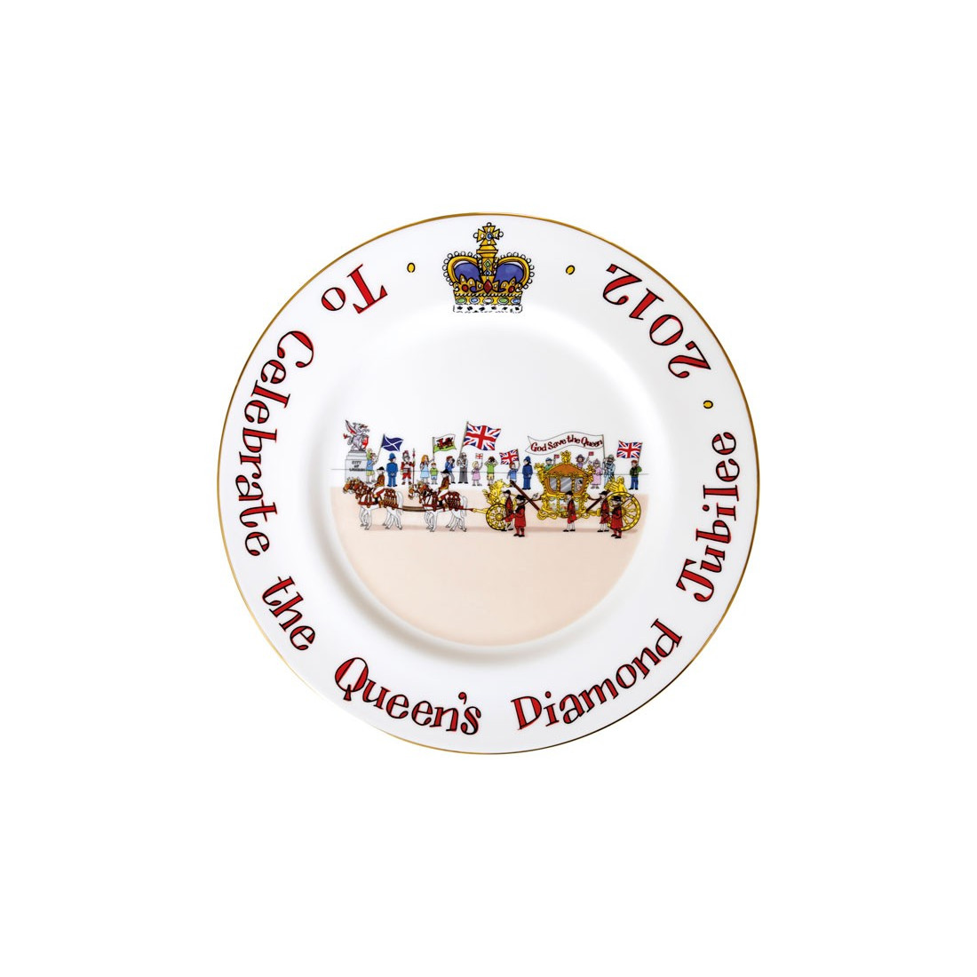 Let your guests enjoy Diamond Jubilee hospitality, eating from this beautiful Diamond Jubilee commemorative plate to treasure the celebrations forever. Alison's quirky design brings the excitement of the Queen's Diamond Jubilee alive. The design depicts Queen Elizabeth ll travelling to St Paul's Cathedral in the city of London in her gold coach, where the service took place on the 5th June 2012.