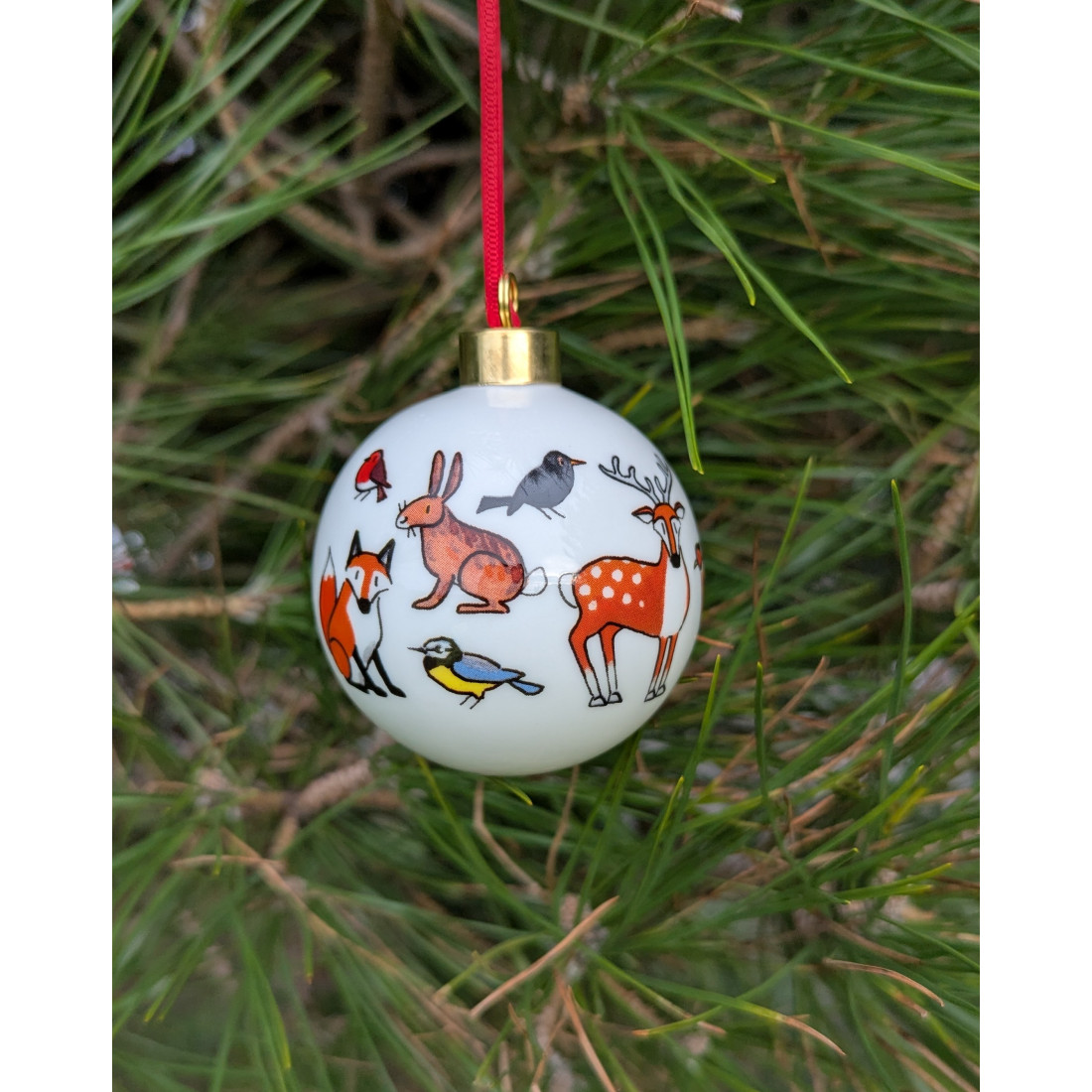 The Winter Wildlife bauble design is decorated with animals and birds that you will see in the chilly winter landscape. One side features a deer, pheasant, owl, hare, blackbird and bluetit. On the reverse of the Christmas bauble is a decorated spruce tree.